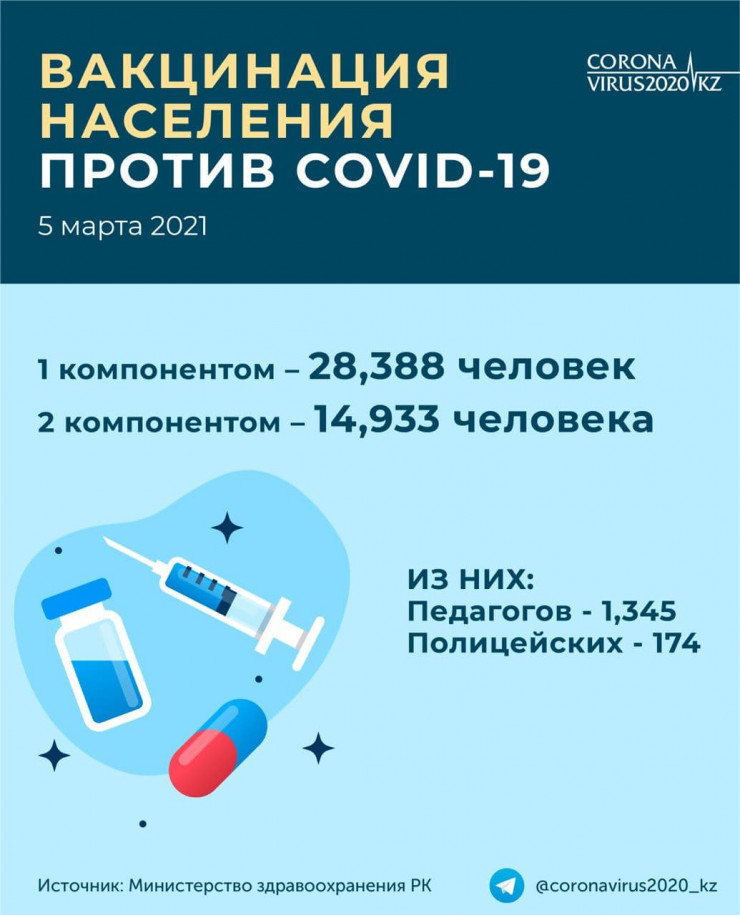 Ранее сообщалось, что с 1 марта в Нур-Султане прививки против коронавируса получат педагоги, воспитатели детских садов, сотрудники правоохранительных органов. В списке вакцинируемых этой группы более 15 тысяч человек.