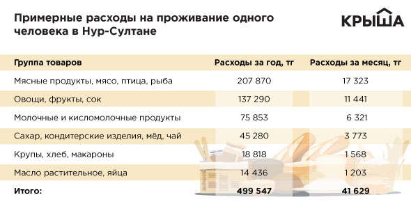 С учетом этих данных и средних цен в торговых точках оказалось, что годовой набор продуктов, лишенный всяческих излишеств вроде газировок, соусов, деликатесов, стоит почти 500 тысяч тенге. Соответственно, ежемесячная норма расходов на еду - более 41 600 тенге, или 1 343 тенге в день на человека.