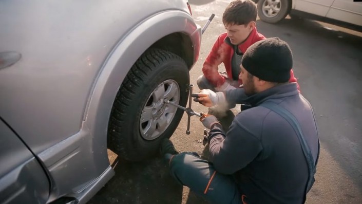 Парень признается, что "собеседование" у мастера Асанали прошел легко и на следующий день уже стоял у входа на шиномонтаж. По его словам, из навыков у него было: открутить болты, поставить домкрат и снять или надеть колесо. Гаечный ключ парень держал лишь по особым случаям. Работа физически трудная, так как колеса весят немало.