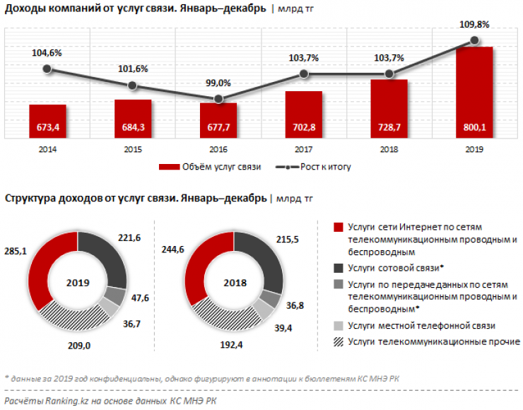 В целом же доходы компаний от услуг связи увеличились на 9,8 процента за год и составили 800,1 миллиарда тенге. Годом ранее доход составил 728,7 миллиарда тенге при росте на 3,7 процента.