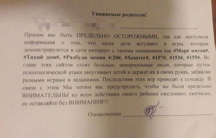 В листовке руководство учебного заведения просит родителей быть предельно осторожными и внимательными ко всем действиям своего ребенка каждый день и час. "Поступила информация о том, что наши дети вступают в игры, которые демонстрируются в сети интернет с такими названиями, как #Море китов#, #Тихий дом#, #Разбуди меня в 4:20#, #Хештег#, #157#, #153#, #155#. Во главе этих сайтов стоят больные ненормальные люди, которые путем психологической атаки запугивают детей и держат их в своих руках, забавляя разными играми и заданиями. Последствия этих игр приводят к суициду", - говорится в тексте.