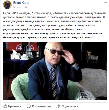 Сообщение с соболезнованиями появилось на странице председателя правления АО "РТРК "Казахстан" Ерлана Карина в Facebook.