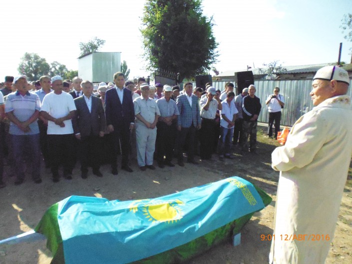 Проводить полицейского в последний путь пришли его родители, братья, родственники, руководство региона и района, Департамента внутренних дел области, а также друзья и сослуживцы. Похоронили Кельдыбаева на местном кладбище. После церемонии погребения состоялся небольшой митинг, во время которого присутствовавшие почтили память усопшего.