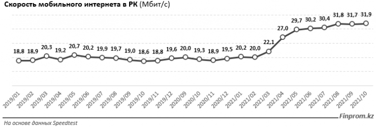 Скорость мобильного интернета в Казахстане составила 31,93 мегабит в секунду, что на 63,6 процента больше, чем в начале года, передает Tengrinews.kz со ссылкой на finprom.kz.