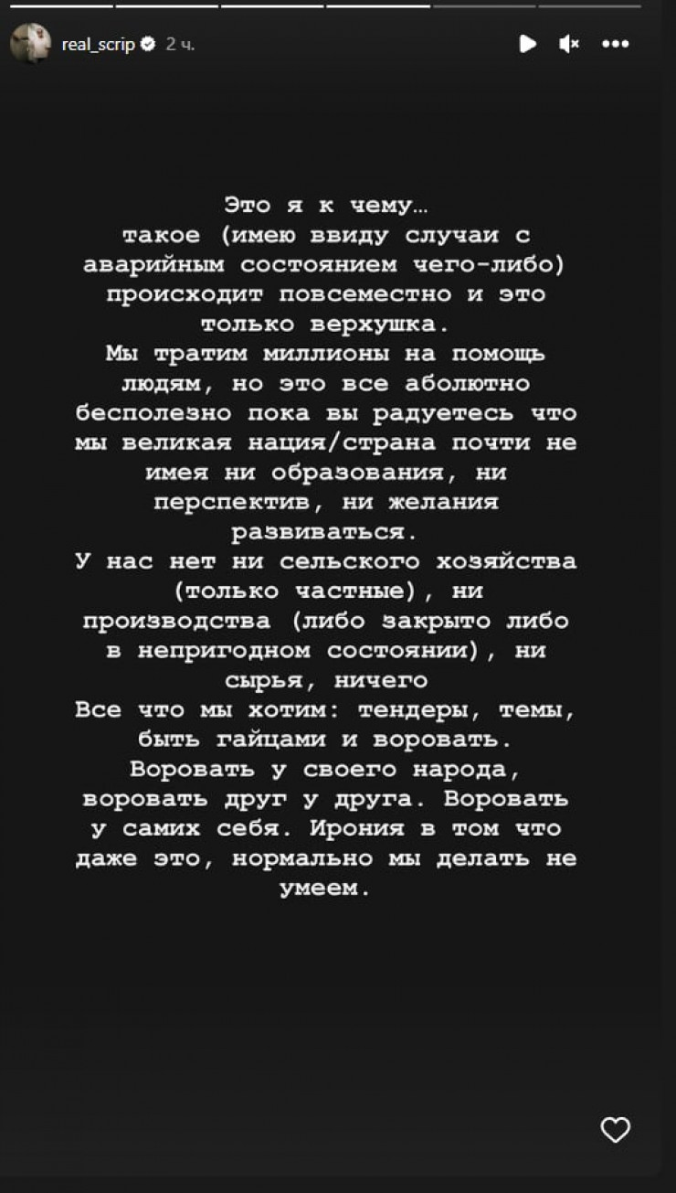 "Мы тратим миллионы на помощь людям, но это все абсолютно бесполезно, пока вы радуетесь, что мы великая нация/страна, почти не имея ни образования, ни перспектив, ни желания развиваться. У нас нет ни сельского хозяйства (только частные), ни производства (либо закрыто, либо в непригодном состоянии), ни сырья, ничего. Все, что мы хотим, - тендеры, темы, быть гайцами и воровать. Воровать у своего народа, воровать друг у друга. Воровать у самих себя. Ирония в том, что даже это нормально мы делать не умеем", - написал Скриптонит.