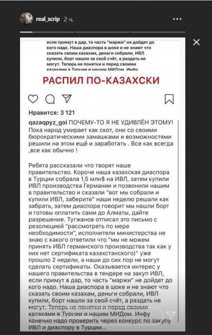 Музыкант опубликовал на своей странице скриншот с информацией о том, что казахская диаспора в Турции закупила аппараты ИВЛ, однако возникли проблемы с их доставкой в Казахстан.