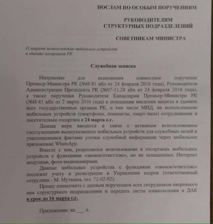 Мемлекеттік органдардың ғимаратында смартфон қолдануға тыйым салу жайлы хат әуелі WhatsApp арқылы тарап кеткен. Желі арқылы тарап кеткен суретте бұл шараның қызметтік мәліметтердің WhatsApp арқылы тарау деректерінің жиілеуіне байланысты қабылданғаны жазылған. Заң 24 наурыздан бастап күшіне енетіні көрсетілген құжатты бастапқыда жұрт желі қолданушыларының қалжыңы деп түсініп, мән бермеген. Артынша қолдан-қолға тарап кеткен қызметтік хаттың түпнұсқа екенін Үкімет мүшелері де растаған.