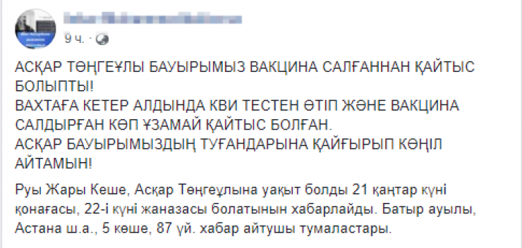 "Наш брат Аскар Тонгеулы умер после вакцинации от коронавируса и теста перед тем, как уйти на вахту", - говорится в опубликованном посте в Facebook.