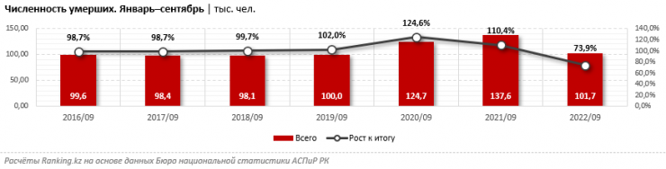С января по сентябрь этого года число умерших в Казахстане составило 101,7 тысячи человек, на 26,1 процента меньше, чем за год до этого. В аналогичный период прошлого года численность умерших достигла 137 тысяч человек, что на 10,4 процента больше, чем за год до этого.