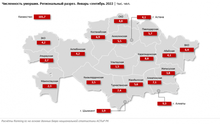 Наибольшая смертность наблюдалась в Алматы (9,3 тысячи человек), в Карагандинской (8,8 тысячи человек) и Туркестанской (7,4 тысячи человек) областях. Наименьшая - в новообразованной Улытауской области (1,5 тысячи человек).