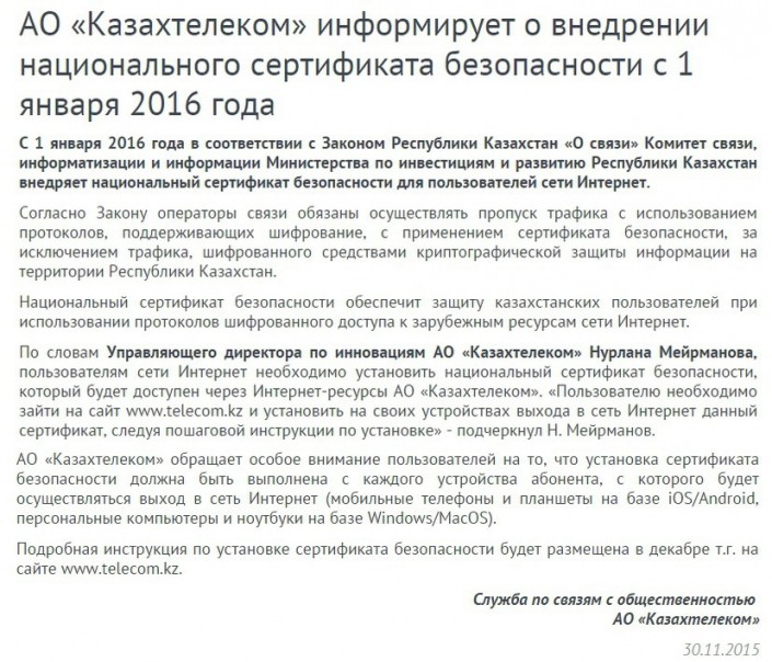 Как сообщает издание, 30 ноября 2015 года на сайте "Казахтелекома" по адресу: https://telecom.kz/news/view/18729, появилось загадочное сообщение, озаглавленное так: "АО "Казахтелеком" информирует о внедрении национального сертификата безопасности с 1 января 2016 года". Однако позже данная страница была либо удалена, либо к ней был закрыт доступ обычным интернет-пользователям, отмечает издание.