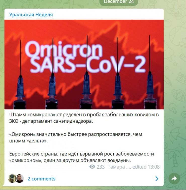 Позже пост об "омикроне" в ЗКО был удален из Telegram-канала "Уральской недели".