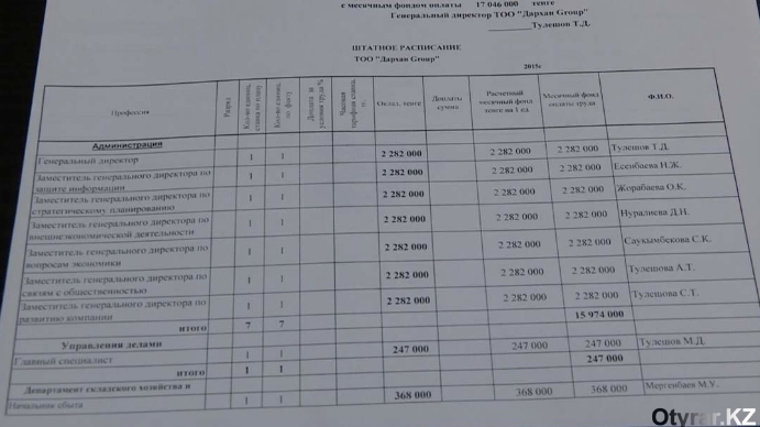 "Все они занимали эти должности формально. Никогда на работу не приходили, заработная плата их составляла по 2 миллиона 282 тысячи тенге в месяц. В то время, когда у нас были такие зарплаты у руководящих, простые рабочие получали по 25-28 тысяч тенге", - добавила начальник Отдела по управлению кадровыми и трудовыми отношениями.