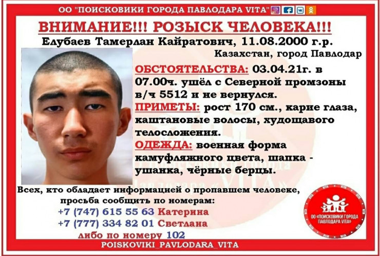 "3 апреля этого года около 06.30 утра военнослужащий срочной службы воинской части 5512, расположенной в Павлодаре, Елюбаев Тамерлан Кайратович, призванный ДДО Акмолинской области в июне 2020 года, самовольно покинул расположение воинской части в неизвестном направлении. О данном факте было сообщено в военно-следственные органы Павлодарской области. Проводится служебное расследование", - прокомментировали в пресс-службе ведомства.
