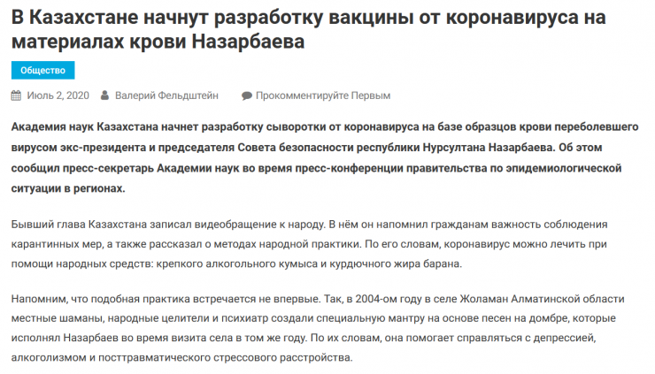 "Распространяемая в сети информация о разработке вакцины от коронавирусной инфекции на материалах крови Назарбаева не соответствует действительности. Уполномоченным органам дано поручение провести соответствующую экспертизу данного материала на предмет нарушения законодательства Республики Казахстан и принять все исчерпывающие меры по недопущению его дальнейшего распространения", - говорится в сообщении МИОР.
