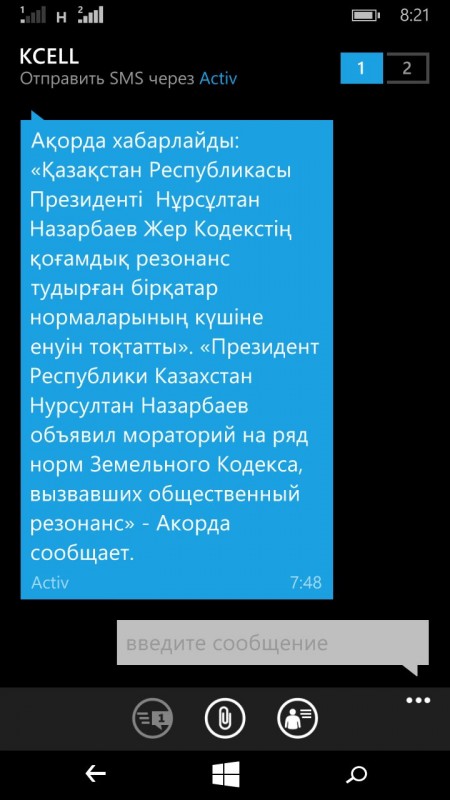 Сотовые операторы Казахстана сделали SMS-рассылку о введении моратория на поправки в Земельный кодекс, который наложил накануне Президент Казахстана Нурсултан Назарбаев, передает корреспондент Tengrinews.kz.