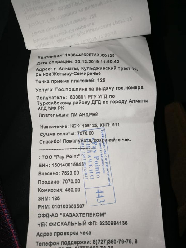 "СпецЦОНов в городе так много, поэтому решил поехать в тот, который находится на Кульджинском тракте. В справочной меня спросили, один или два номера хочу поменять. На ответ "один" мне сказали, что "один поменять нельзя, можно только два, и для этого необходимо заплатить 12 тысяч тенге в кассе". Тут столкнулся с первой проблемой. На кассе принимаются только наличные, поэтому пошел в банкомат снимать деньги. После оплаты на кассе мне дают аж три квитанции. Произошла оплата регистрации автомобиля, нового техпаспорта и выдачи госномера", - поделился Андрей Ли.