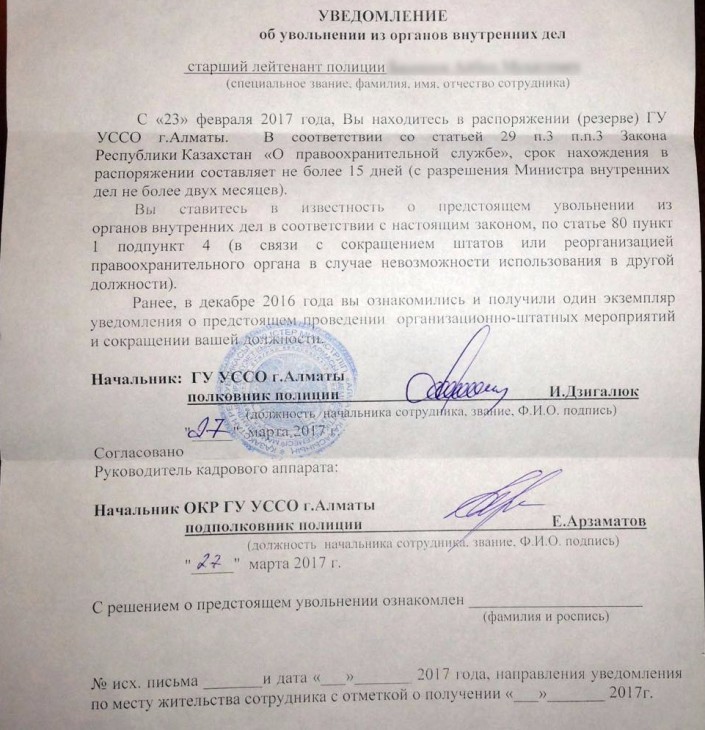 "В дальнейшем из указанного количества сотрудников (35 человек. - Прим. автора) несколько человек были отправлены на пенсию, а остальные получили уведомления об увольнении из органов внутренних дел. По "чистой" случайности ими почему-то оказались именно те сотрудники, которые подписали вышеуказанное коллективное заявление, по которому ведется досудебное расследование. Наши требования об ознакомлении с данным приказом и вопросы о том, когда и кем он был подписан, были проигнорированы. Далее руководство УССО требует от нас в принудительной форме подать рапорты о согласии с переводом в Астану, но вновь без ознакомления с приказом. В итоге нам в ультимативной форме заявили об увольнении якобы в связи с сокращением штата и дали десять дней для самостоятельного поиска нового места службы с запретом выхода на работу в УССО. Но самое непонятное заключается в том, что после нашего увольнения якобы в связи с сокращением штата на наши же места набирают новых сотрудников", - говорится в письме сотрудников УССО Алматы.