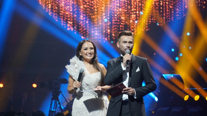 Ведущие международного музыкального вечера - известная казахстанская телеведущая Ляйла Султанкызы и российский шоумен Андрей Разыграев. Приглашая хедлайнера вечера, ведущие отметили, что с появлением этого артиста, цвет настроения зрителей станет синим.