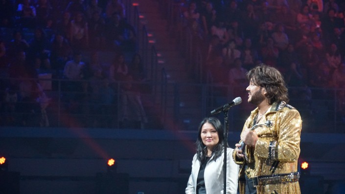 "В прошлом году мне исполнилось 50. Разве имеют значение эти цифры? Это всего лишь информация для паспорта. А для меня это был повод сделать красивое шоу и привезти его в Казахстан. Для меня большая мечта приехать с этим шоу в Астану. Я даю вам слово, что я в следующем году обязательно приеду. Пусть эта премия, награда станет стимулом для меня. Для того, чтобы снова и снова приезжать сюда. Петь для вас, радовать и создавать настроение синего, голубого, розового цвета. Главное, чтобы на душе было всегда радужное настроение", - сказал Филипп Киркоров и покинул арену с огромным букетом алых роз.