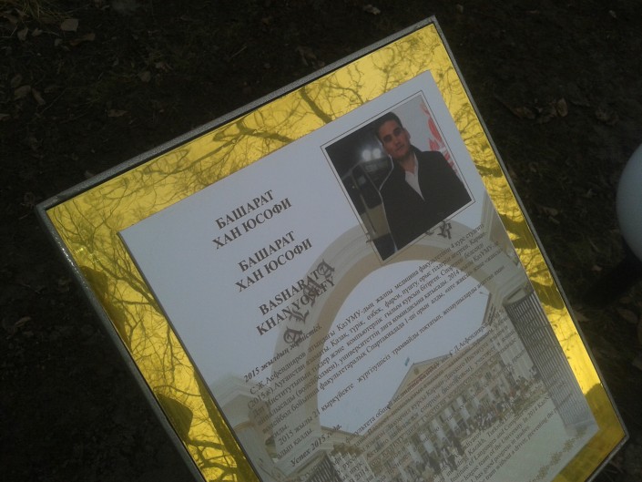Афганскому студенту Башарату хан Юсофи, который остановил неуправляемый трамвай во время ДТП в Алматы 13 октября 2015 года, присвоили звание "Гордость университета", передает корреспондент Tengrinews.kz. Памятную медаль и диплом вручил ректор Казахского национального медицинского университета имени Асфендиярова Айкан Аканов в рамках церемонии, посвященной 85-летию ВУЗа. Хан Юсефи был награжден наряду с такими выпускниками вуза, как личный врач космонавта Айдына Аимбетова Сауле Туруспекова и вице-премьер министр Кыргызстана Дамира Ниязалиева. Их имена сейчас размещены на табличках на специальной аллее вуза, называющейся "Успех года".