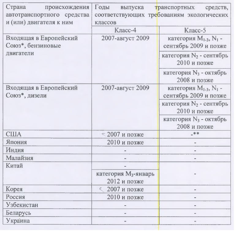 Список составлен на основании приказа министра по инвестициям и развитию Казахстана "Об утверждении допустимых параметров автотранспортных средств, предназначенных для передвижения по автомобильным дорогам РК", который вступил в силу 26 мая. Таблица определяет год выпуска автомобилей различных стран производства, которые соответствуют экологическому стандарту Евро-4 и могут быть зарегистрированы органами дорожной полиции в Казахстане.