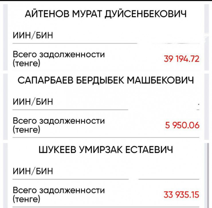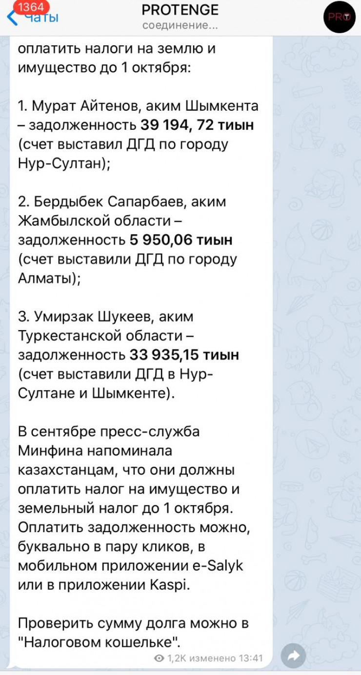 Информация о том, что аким Шымкента Мурат Айтенов, аким Туркестанской области Умирзак Шукеев и аким Жамбылской области Бердибек Сапарбаев должны государству, появилась в Telegram-канале PROTENGE.
