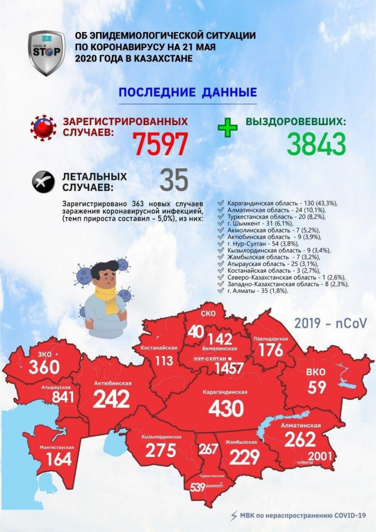 За прошедшие сутки в Казахстане выявлено 363 заболевших коронавирусной инфекцией. Прирост составил 5 процентов.