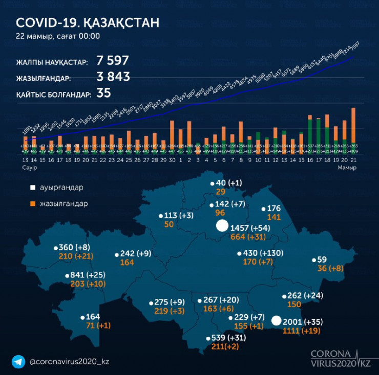 Всего в стране выявлено 7597 заболевших коронавирусом, число выздоровевших пациентов увеличилось до 3843 человек. 35 летальных случаев от COVID-19.