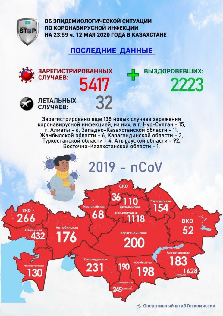 По состоянию на 23:59 12 мая в Казахстане зарегистрировано еще 138 новых случаев заражения коронавирусной инфекцией. Из них в Нур-Султане - 15, в Алматы - 6, в Западно-Казахстанской области - 11, в Жамбылской области - 6, в Карагандинской области - 3, в Туркестанской области - 4, в Атырауской области - 92, в Восточно-Казахстанской области - 1.