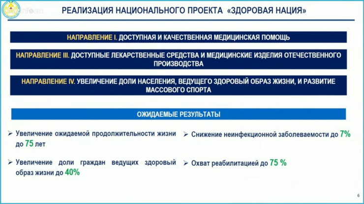 Она рассказала о принятом национальном проекте "Здоровая нация", в рамках которого реализуются меры по обеспечению населения доступной и качественной медпомощью, лекарственному обеспечению, увеличению доли населения, ведущего здоровый образ жизни.