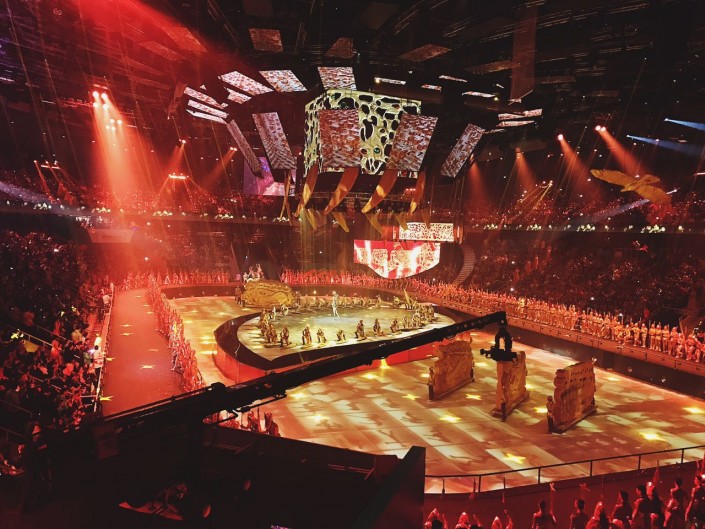 Центральная сцена ледового дворца "Алматы Арена", которая способна вместить более 12 тысяч зрителей, оформлена в виде лепестка - своеобразного символа жизни, мудрости и любви.
