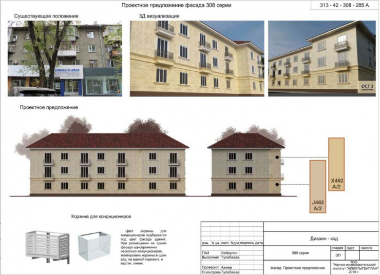 "Каждый закрывал балконы, как он мог, никто не соблюдал никаких границ, это уродует общий облик здания. Наше первое предложение - сделать рамки, за которые жильцы не смогут выходить, и использовать одинаковые материалы. Второй вариант - полностью открыть балконы и убрать остекление. А кондиционеры, которые раскиданы по всему фасаду, мы предлагаем выровнять по оси и поставить в решетки одинакового типа", - рассказала ведущий архитектор НИИ "Алматыгенплан" Мадина Тулебаева.