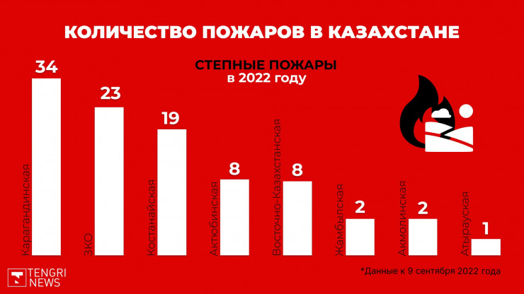 Что касается степных пожаров, то в этом году первое место пока занимает Карагандинская область - 34 случая. За ней расположилась Западно-Казахстанская (23 пожара) и Костанайская область (19 инцидентов). Наименьшее количество зарегистрировано в Жамбылской и Акмолинской (по два случая), а также Атырауской области (1 степной пожар). Подобных инцидентов пока не зафиксировано в Алматинской, Кызылординской, Мангистауской, Павлодарской, Северо-Казахстанской и Туркестанской областях.