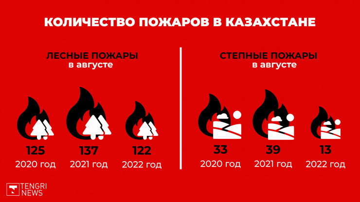 А степных пожаров зафиксировали 13 в августе 2022 года, 39 в прошлом и 33 - позапрошлом. Динамика показывает, что в августе такие инциденты сократились втрое.