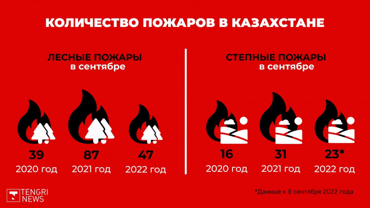 Степных пожаров к 9 сентября 2022 года зафиксировано 23, тогда как в прошлом году за целый месяц произошел 31 такой инцидент. А еще годом ранее - всего 16. Возможно, низкие показатели 2020 года объясняются карантинными ограничениями, действовавшими в тот период. Это, скорее всего, снизило риски возникновения степных и лесных пожаров.