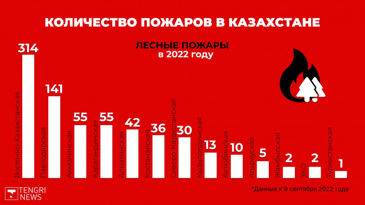 В этом году больше всего лесных пожаров произошло в Восточно-Казахстанской области - 314. Второе место занимает Павлодарская область - 141 случай. Меньше всего зафиксировано в Жамбылской и Западно-Казахстанской (по 2 раза), а также в Туркестанской области (1 лесной пожар). Стоит отметить, что единственным регионом, где в 2022 году не было лесных пожаров, остается Мангистауская область.