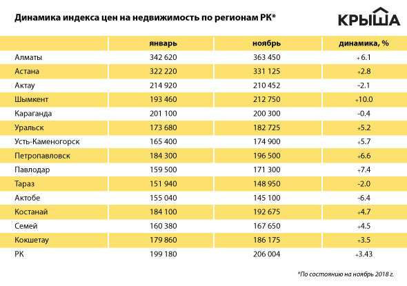 В Алматы индекс "Крыши" вырос на 0,9 процента, или 3 230 тенге. В ноябре он в очередной раз обновил годовой максимум и достиг отметки 363,5 тысячи тенге за единицу площади.