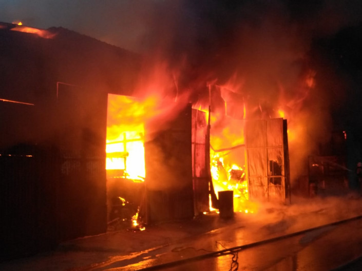 Вдоль автодороги Алматы - Бишкек на территории строительного рынка "Барыс-3" загорелся ангар со строительными материалами, передает Tengrinews.kz со ссылкой на официального представителя КЧС МВД Нурсултана Нурахметова.