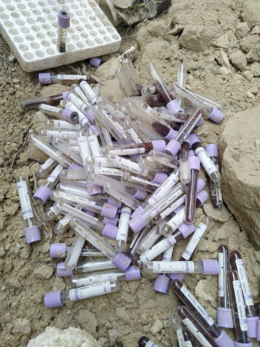 Местные жители нашли большое количество медотходов, в том числе пробирки с кровью и емкости для сбора мочи.