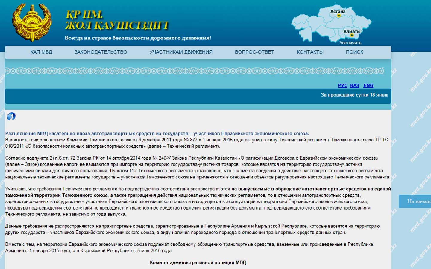 При этом чиновники апеллируют к Закону "О дорожном движении" и Техническому регламенту Таможенного союза. Хотя еще неделю назад сообщалось, что с 1 января в Казахстане сняты ограничения по годам выпуска и соответствию экологическим нормам Евро-4 для автомобилей, ввозимых с территории стран ЕАЭС - России и Беларуси. А сотрудники КАП МВД РК разослали в регионы разъяснения для своих коллег, трактующие новые нормы.