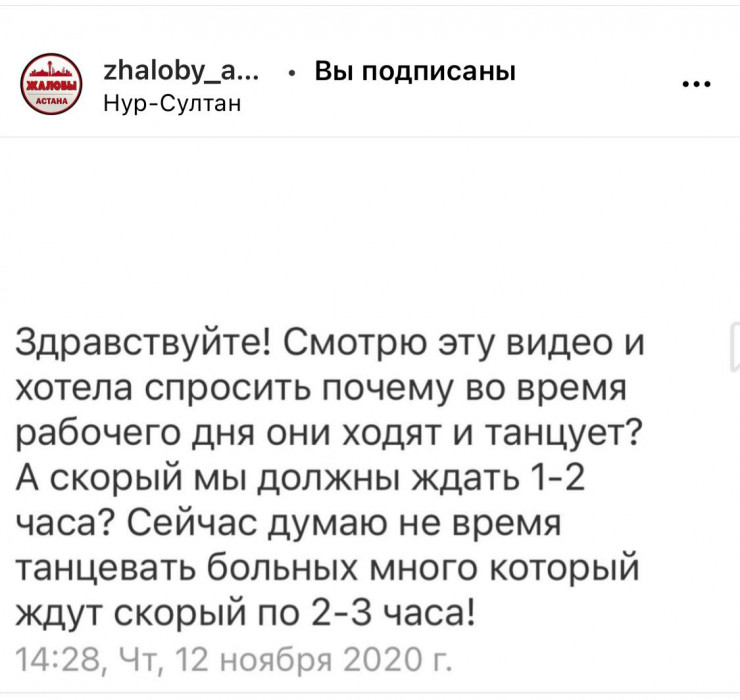 Видео появилось на странице zhaloby_astana в Instagram. На кадрах видно, как медработники выходят из машины скорой помощи и задорно танцуют.