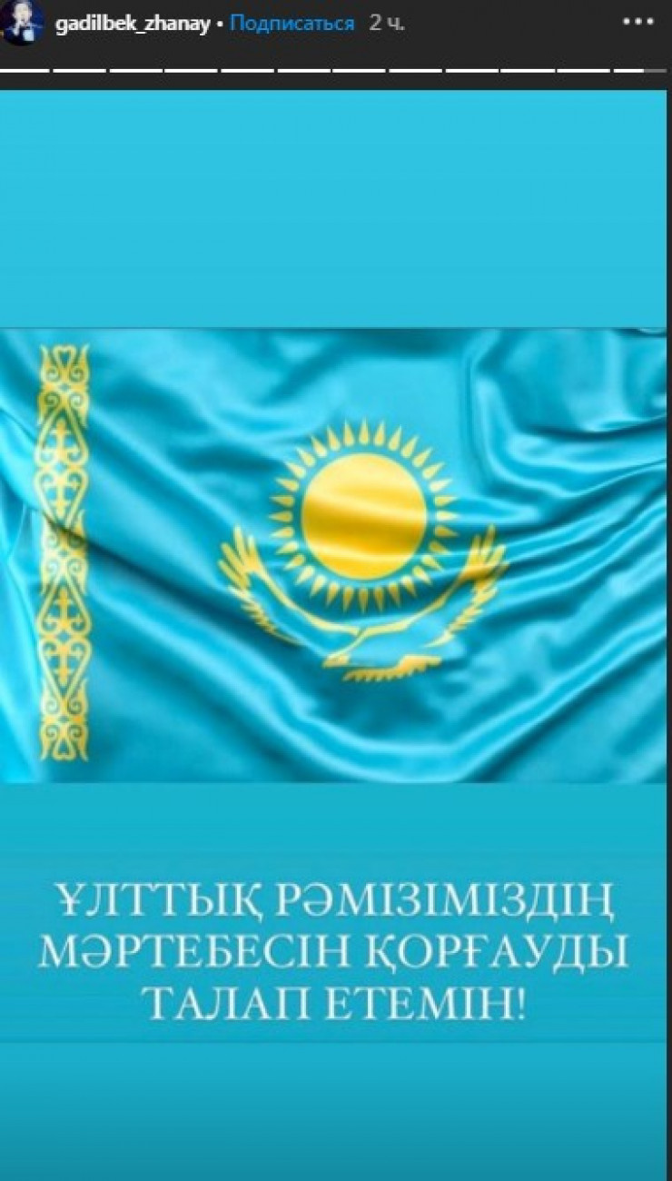 Қазақ эстрадасының тағы бір әншісі Бейбіт Күшқалиев мемлекеттік рәміздердің мәртебесін қорғауды талап ететінін айтып, пост жариялады.