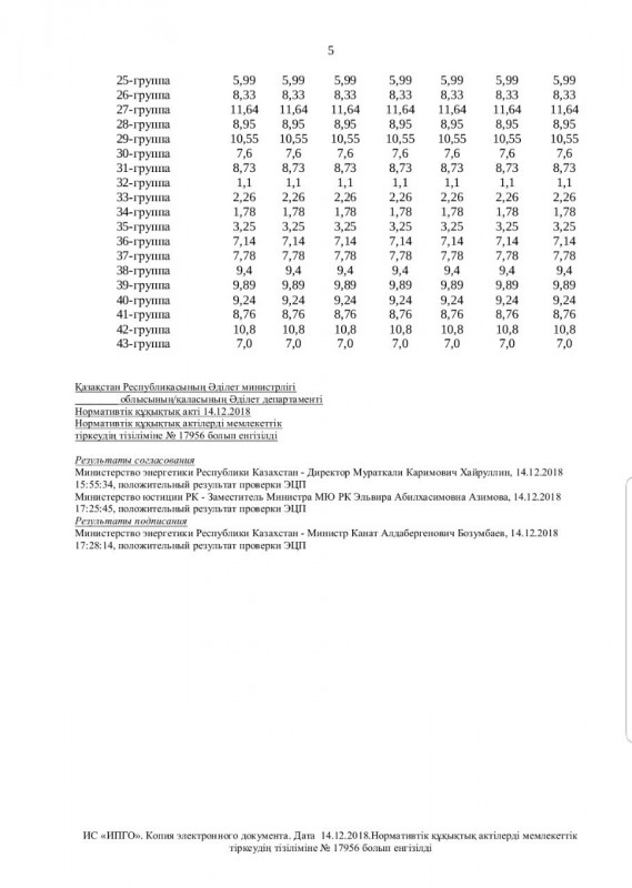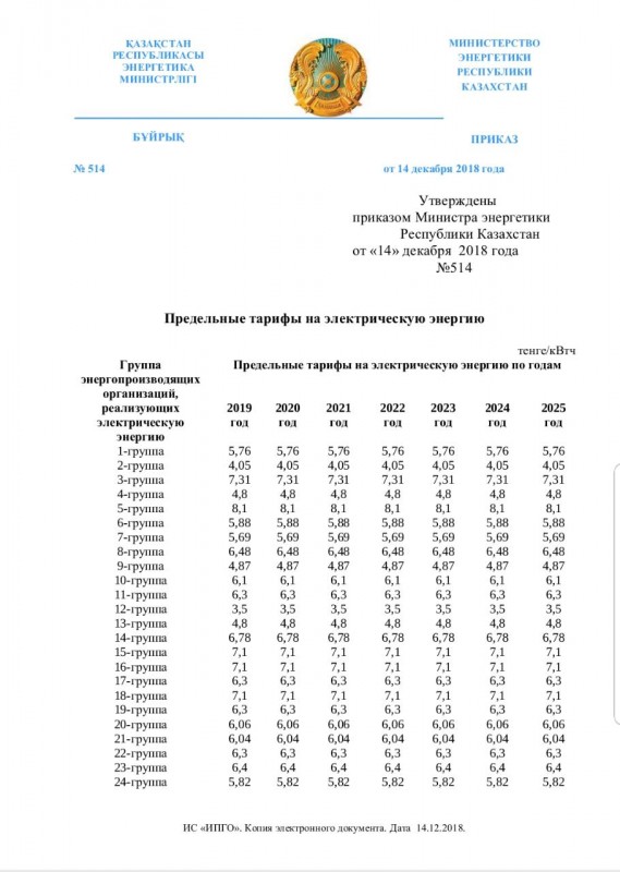 Так, например, предельные тарифы АО "Астана-Энергия" (9-я группа) установлены в размере 4,87 тенге за 1 киловатт-час, АО "Алматинские электрические станции" ТЭЦ-1, -2, -3, Капшагайская ГЭС, Каскад ГЭС (26-я группа) - 8,33, Экибастузская ГРЭС-1 (1-я группа) - 5,76 тенге. С названиями других энергопроизводящих компаний, разделенных на группы, можно ознакомиться по ссылке