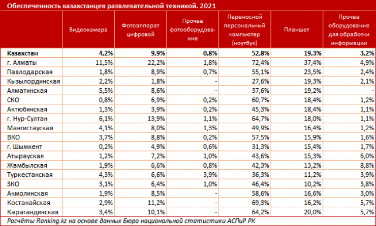 Музыкальные центры, видеокамеры, фотоаппараты, ноутбуки и планшеты чаще всего имелись в наличии у семей в Алматы, спутниковые антенны - у жителей Северо-Казахстанской области.