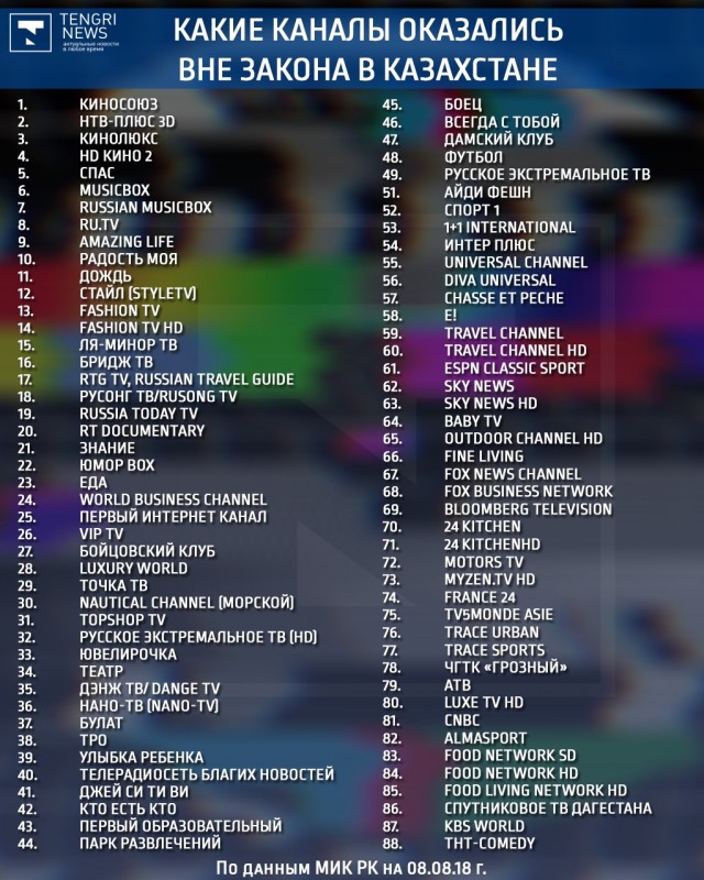 THT-Comedy, "Боец" и Russia Today TV. Какие каналы вне закона в Казахстане