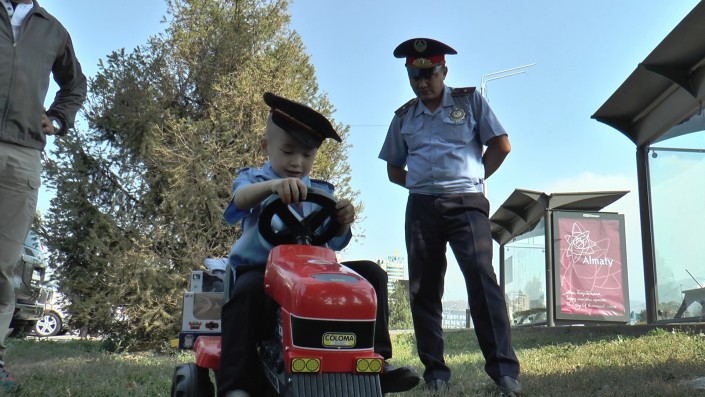 Мальчику вручили и собственный игрушечный автомобиль, на котором Адилет может лично патрулировать территорию своего двора.