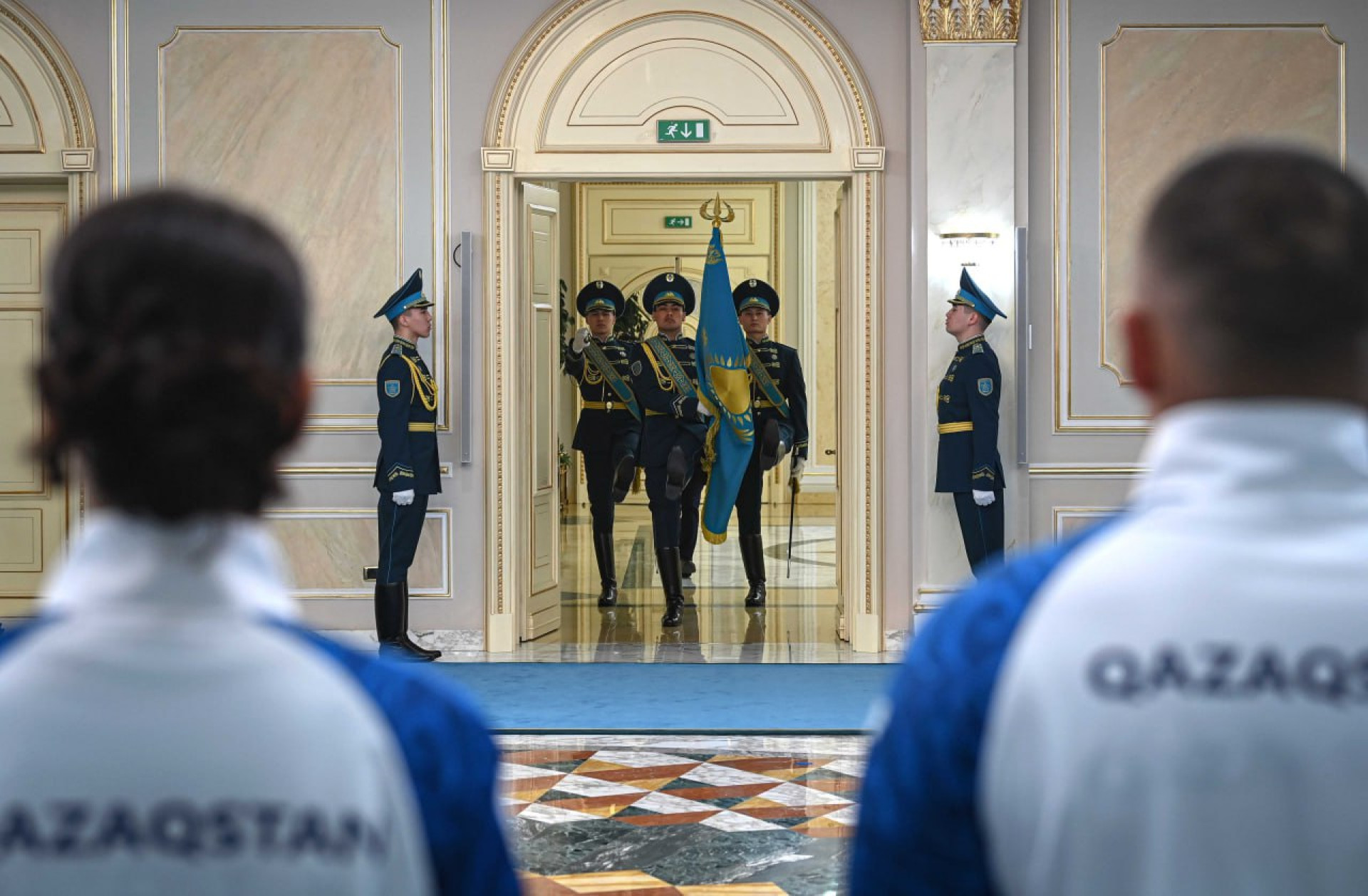 Касым-Жомарт Токаев вручил Государственный флаг Республики Казахстан членам национальной сборной — Денису Никише, Аяулым Амреновой и члену паралимпийской сборной Казахстана Ерболу Хамитову.