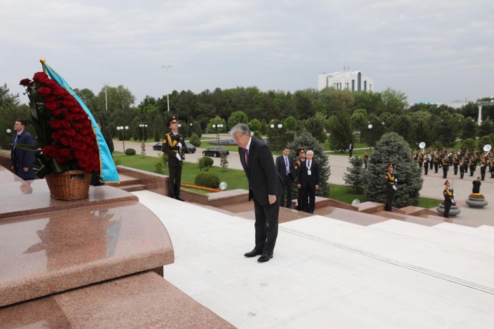 Возложение цветов к монументу прошло в ходе первого государственного визита Касым-Жомарта Токаева в Узбекистан.