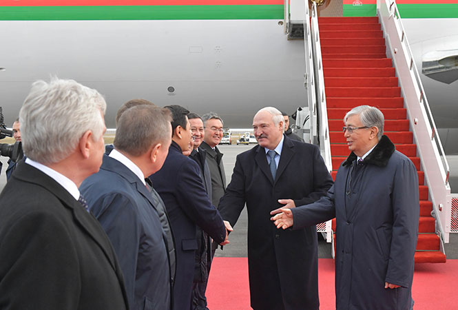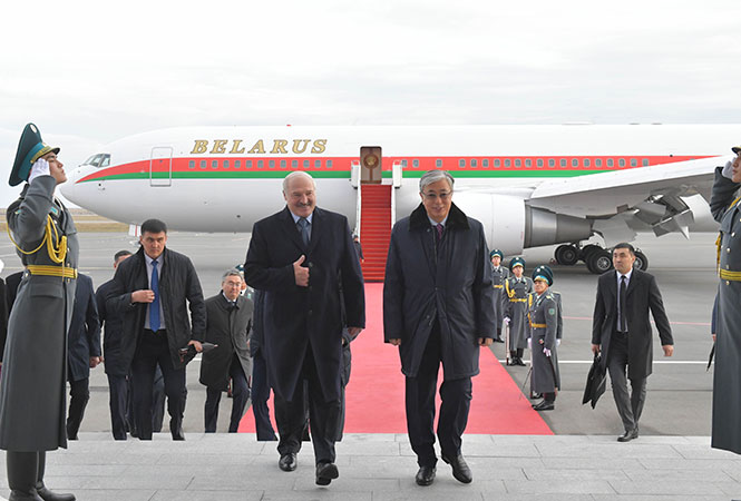 Белорусский борт номер один сел в аэропорту Нурсултан Назарбаев. Президент Касым-Жомарт Токаев лично встретил Александра Лукашенко.